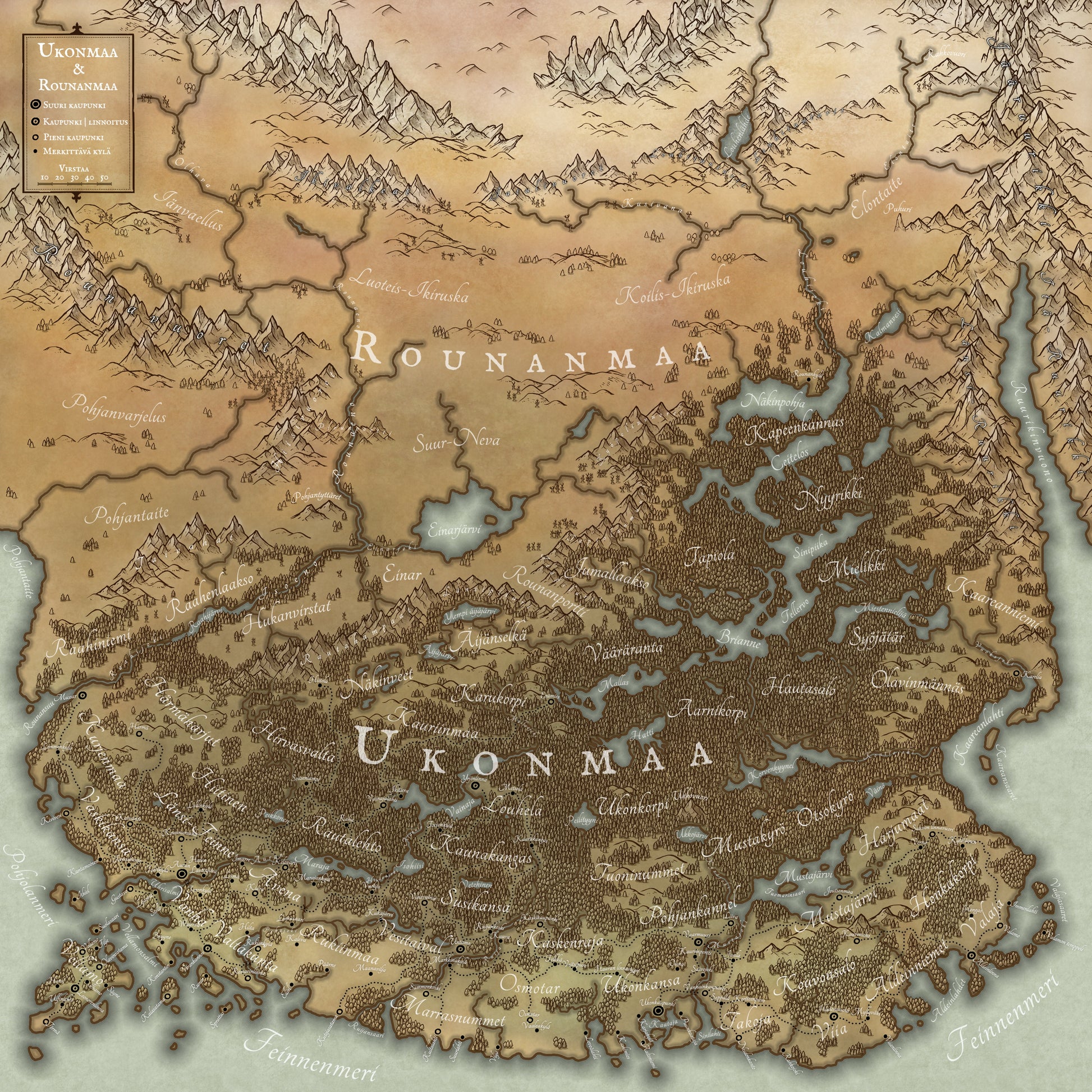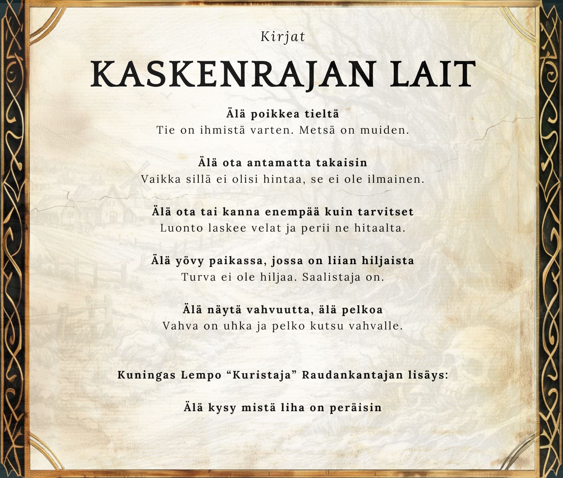 Kirjassa matkataan ihmisille vihamieliselle alueelle kaskenrajan taakse synkkiin metsiin, jotka kätkevät lehvustojen alle menneisyyden julmia tekoja. Toiset matkaavat aina Rounanmaan tuntureille saakka ja kohtaavat erämaan tappavat vaarat. Joskus taas ei tarvitse edes poistua kotoaan, kun häijyimmät olennot raapivat ovea – tai sängyn pohjaa.